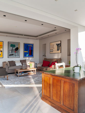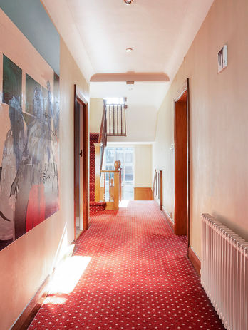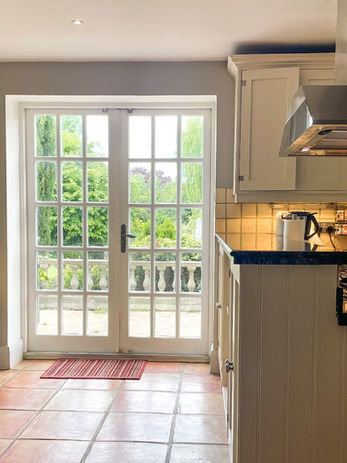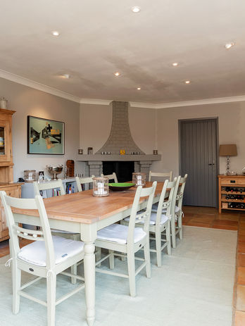 A white period French Country House Style property with 5 bedrooms, 4 bathrooms, 2 kitchens, Dining Room, Sitting Room, Original panelled TV room, large kitchen, 2 garages and a large double rear garden with mature planting and a heated swimming pool.
